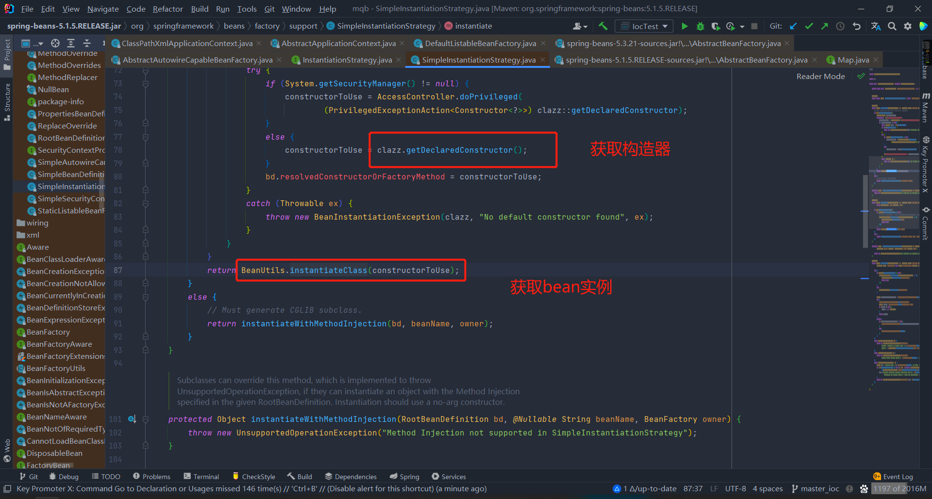 进入 instantiateBean(beanName, mbd); 方法 找到 SimpleInstantiationStrategy 的 instantiate 方法,里面得到了无参构造